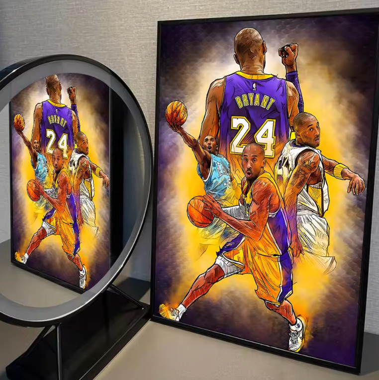 This dynamic art print features Kobe Bryant in action, capturing multiple iconic moments from his legendary career. With vivid colors and striking details, it celebrates his skill, determination, and impact on the game. Perfect for any Lakers fan or collector, this piece is a tribute to one of basketball's GOAT's!