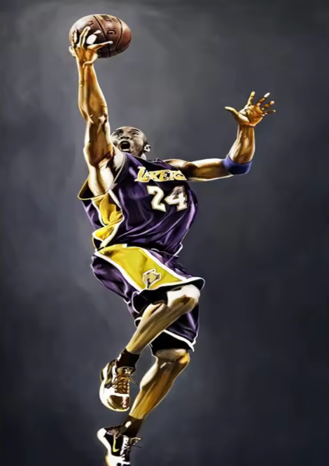This stunning artwork captures the electrifying energy of Kobe Bryant mid-dunk, dressed in his iconic Lakers jersey.