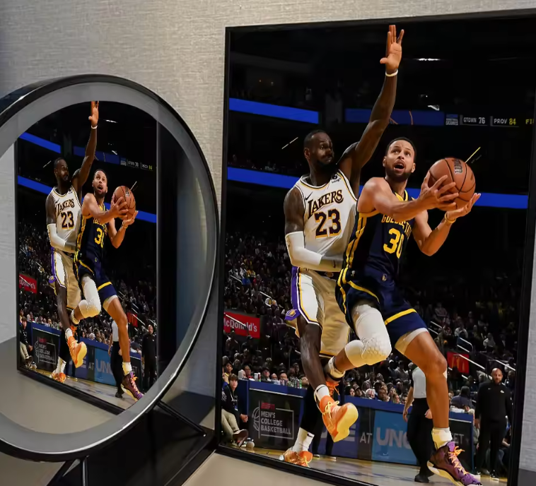 Bring the intensity of the NBA to your home with this striking photo of LeBron James and Stephen Curry in a fierce moment of gameplay.