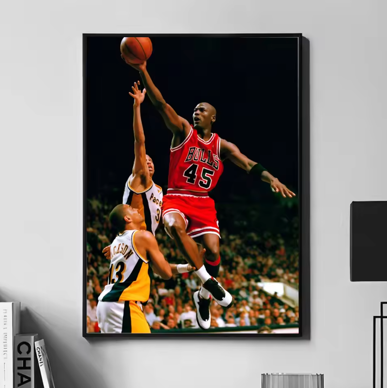 Relive the intensity of Michael Jordan's comeback with this incredible action shot, featuring MJ in his iconic #45 jersey.