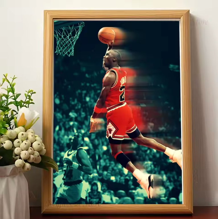 Capture the essence of greatness with this iconic framed poster, featuring the legendary Michael Jordan taking flight mid-game! Vibrant and dynamic, this artwork is perfect for all fanatics, adding energy and inspiration to any room. A slam dunk for your decor!