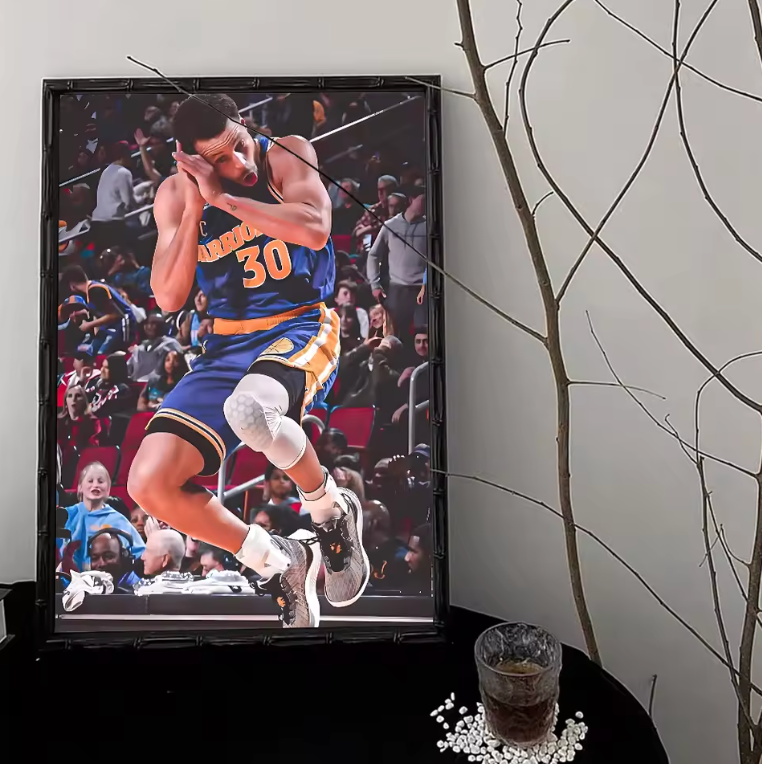 Capture the essence of pure emotion and basketball brilliance with this dynamic shot of Stephen Curry in mid-celebration.