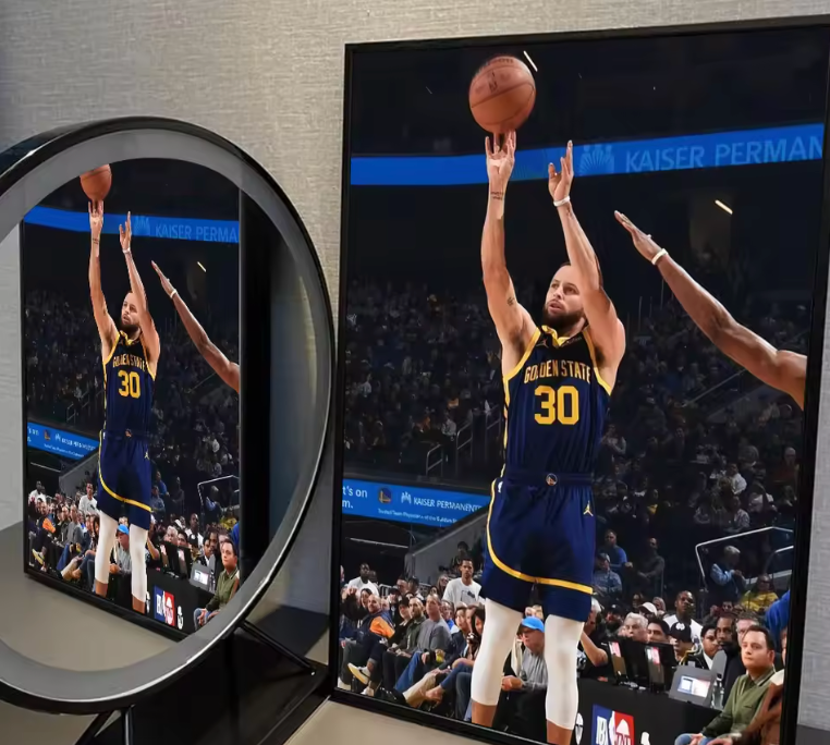 Capture the moment of pure precision with this iconic image of Stephen Curry, the NBA’s sharpest shooter, in mid-action.